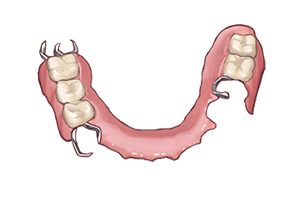 お口の中に装着する際、残っている歯に金属のクラスプが引っかかることで入れ歯全体を固定します。